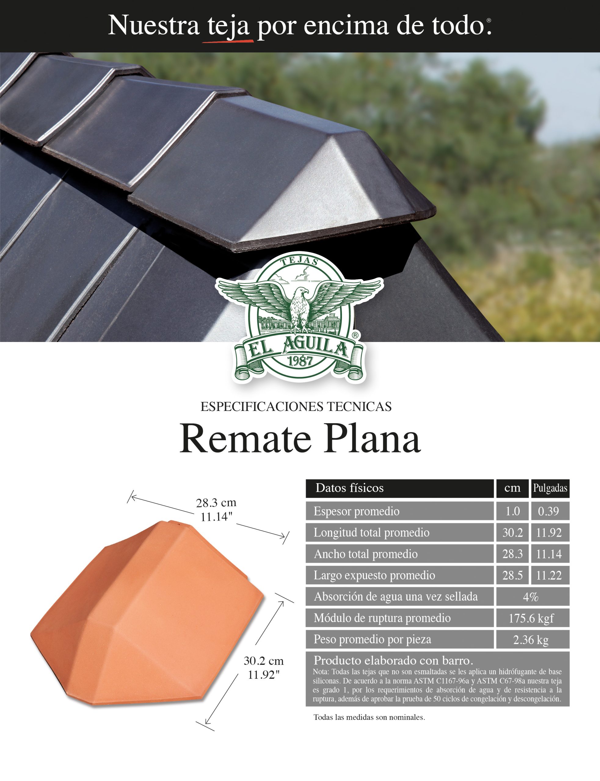 - El Remate Final Plana es de barro extruido y prensado, color barro-terracota.